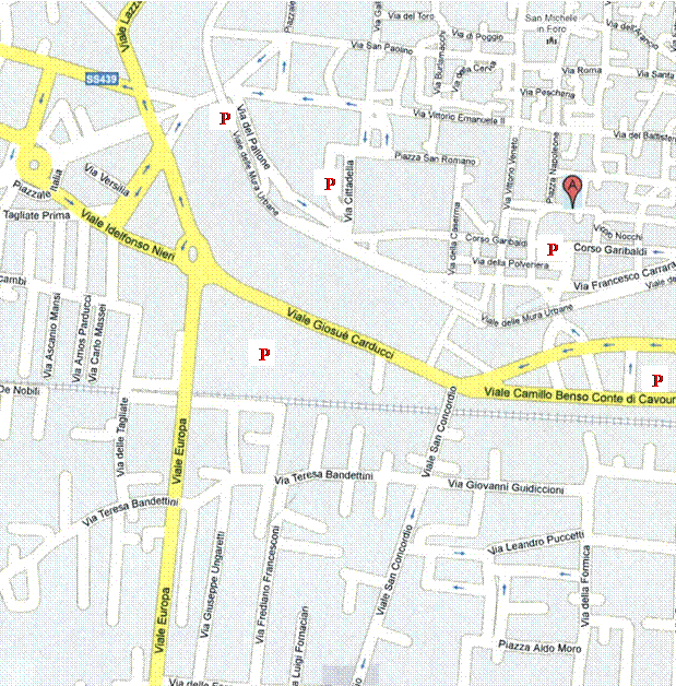 From the exit of the motorway (Lucca Est) following the direction to the city centre and pass the overpass. At the first traffic circle turn right keeping the city wall on the left. Go ahead until the railway station and then turn right to enter inside the city wall driving through Porta San Pietro. Turn right (Via Francesco Carrara) and at the end of this road turn left.