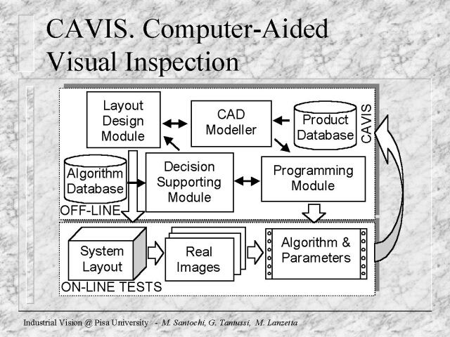 | Staff The Vision Group at the DIMNP includes: prof. M. Santochi, prof. G. Tantussi and prof. Gino Dini. Former and present students of the Vision Lab are listed here. SoftwareI am currently developing in Visual Basic® a general purpose interface integrating both standard and new designed algorithms that I have used and tested in my research experience. The software can be run on any 32 bit Windows®-based PC and is called iVision©. It integrates the Matrox™ Imaging Library and is able to exchange data with Matlab® - Mathworks™. HardwareThe laboratory is equipped with different PCs, frame grabbers and cameras from the following manufacturers: Matrox (Image LC, Meteor2 MC cards and related software), JAI (M50 and M90 cameras), Play (Snappy card). Go back to the abstract. |